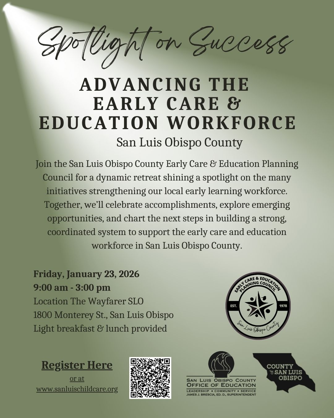 Save the date! Spotlight to Success: Advancing the Early Care & Education Workforce is coming Friday, Jan. 23, 9 AM–3 PM. Join the SLO County Early Care & Education Planning Council for a dynamic retreat highlighting the initiatives strengthening our local early learning workforce. Celebrate wins, explore new opportunities, and help chart the next steps for a strong, coordinated system in SLO County. Location: The Wayfarer SLO, 1800 Monterey Street. Light breakfast & lunch provided. Register: sanluischildcare.org