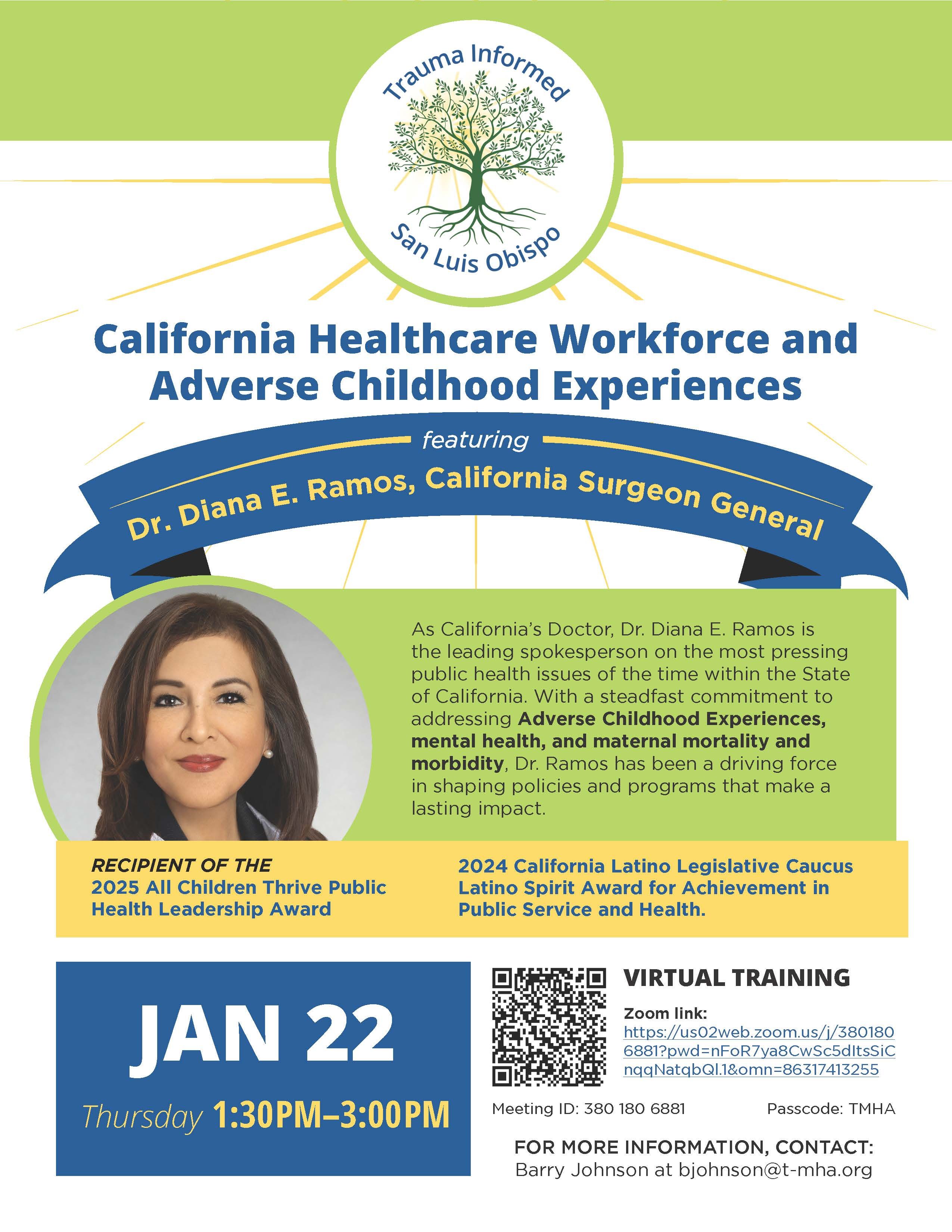 Big conversations, lasting impact. Join Trauma Informed SLO for a virtual conversation with Dr. Diana E. Ramos, California Surgeon General, on Thursday, January 22 from 1:30–3:00 PM. Dr. Ramos will share updates on California’s healthcare workforce and the latest on Adverse Childhood Experiences (ACEs) research and implementation.