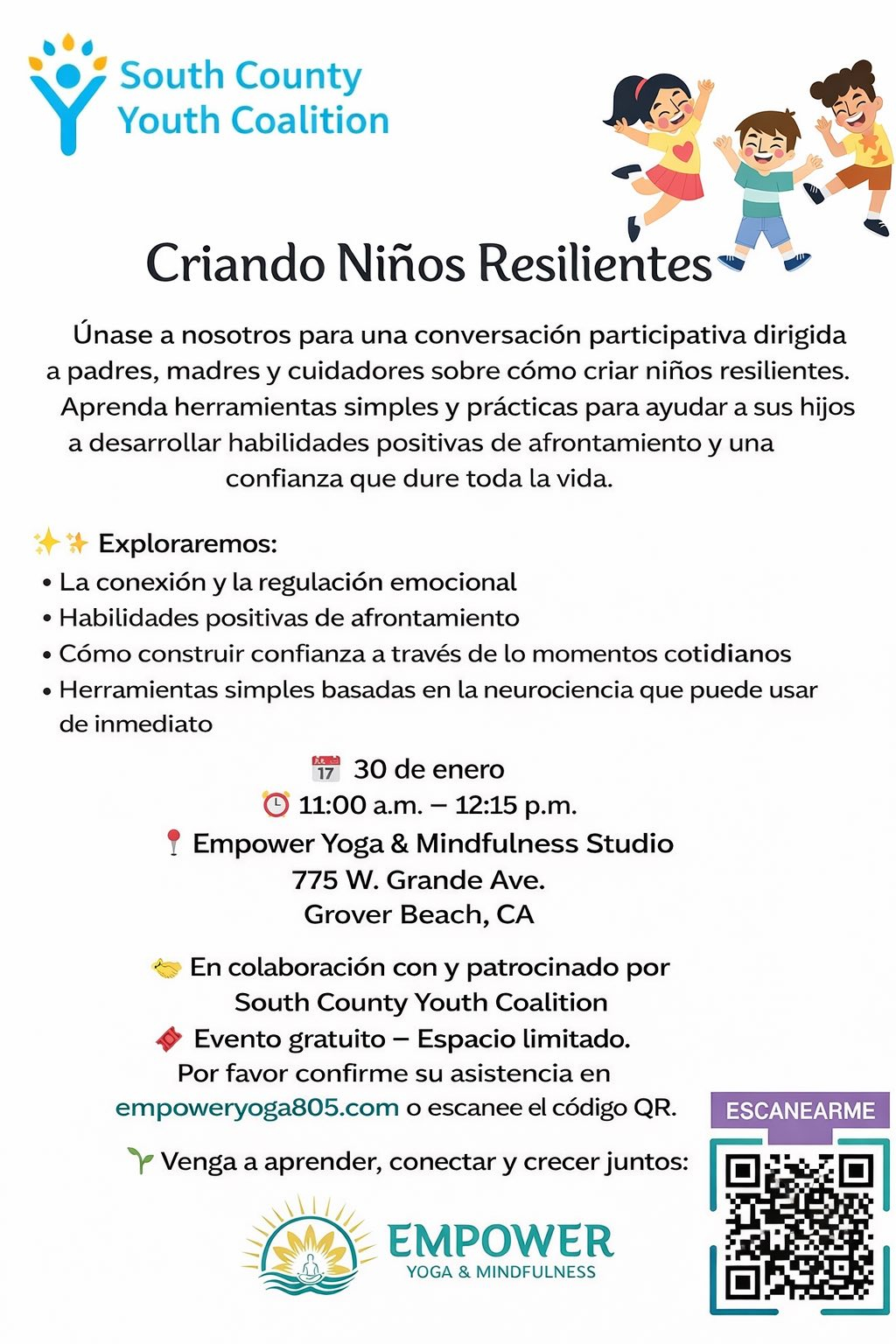 Padres y cuidadores: únanse a la Coalición Juvenil del Sur del Condado para «Criar niños resilientes». Aprenda herramientas prácticas basadas en el cerebro para ayudar a los niños a desarrollar confianza, regulación emocional y habilidades saludables para afrontar situaciones difíciles.