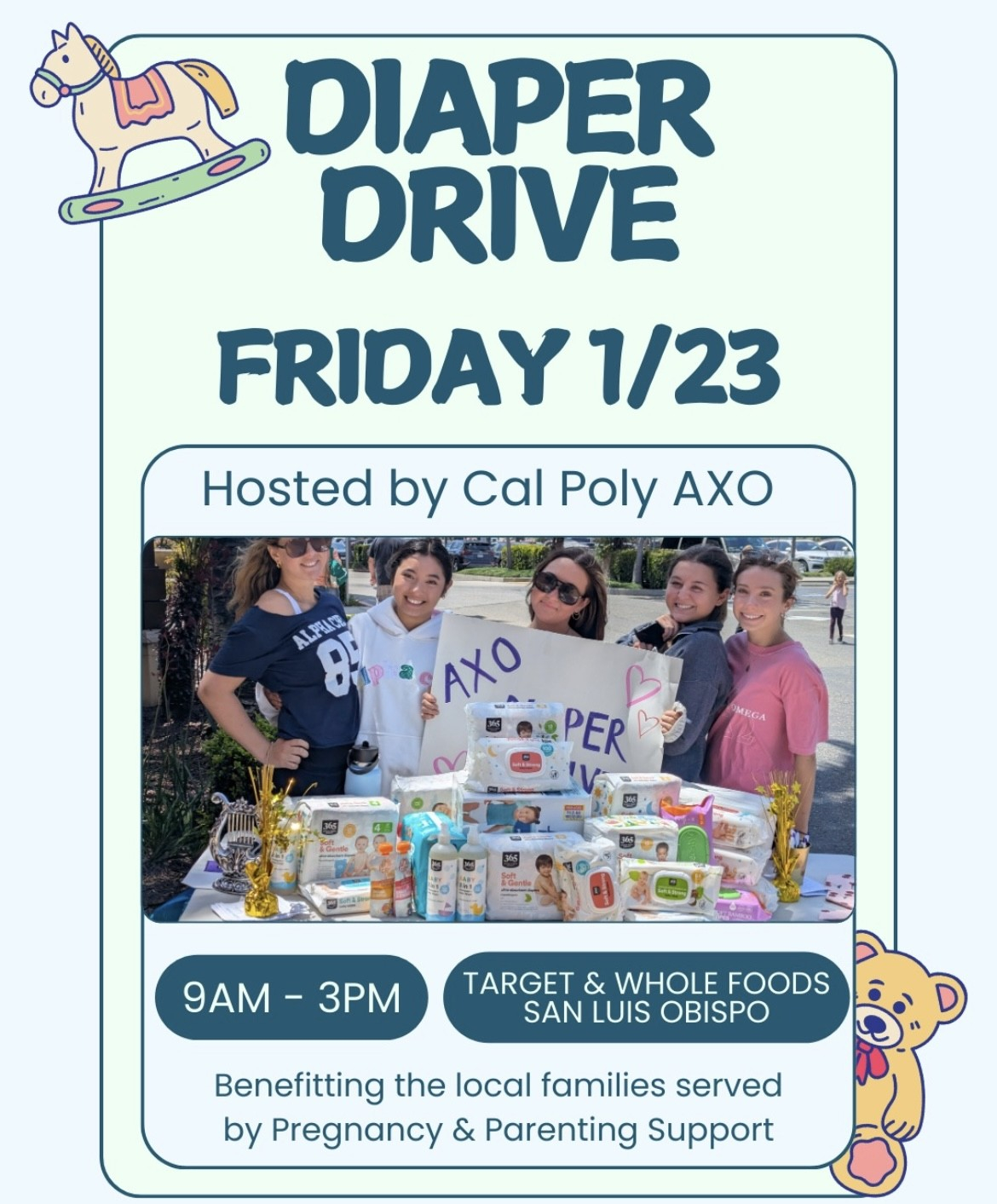Join Cal Poly AXO for a Diaper Drive on Friday, 1/23 from 9AM–3PM, supporting local families served by Pregnancy & Parenting Support of San Luis Obispo County. Drop-off locations: Target (SLO) & Whole Foods (SLO) / Most needed: Diapers / Also accepted: Baby wipes / Every donation makes a real difference for families right here in our community.