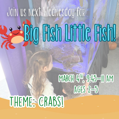 Join the Central Coast Aquarium for Big Fish Little Fish, Wednesday, March 4th from 9:45AM to 11AM. Learn all about crustacean-friend crabs For ages 2-5 years. To sign up, visit centralcoastaquarium.org