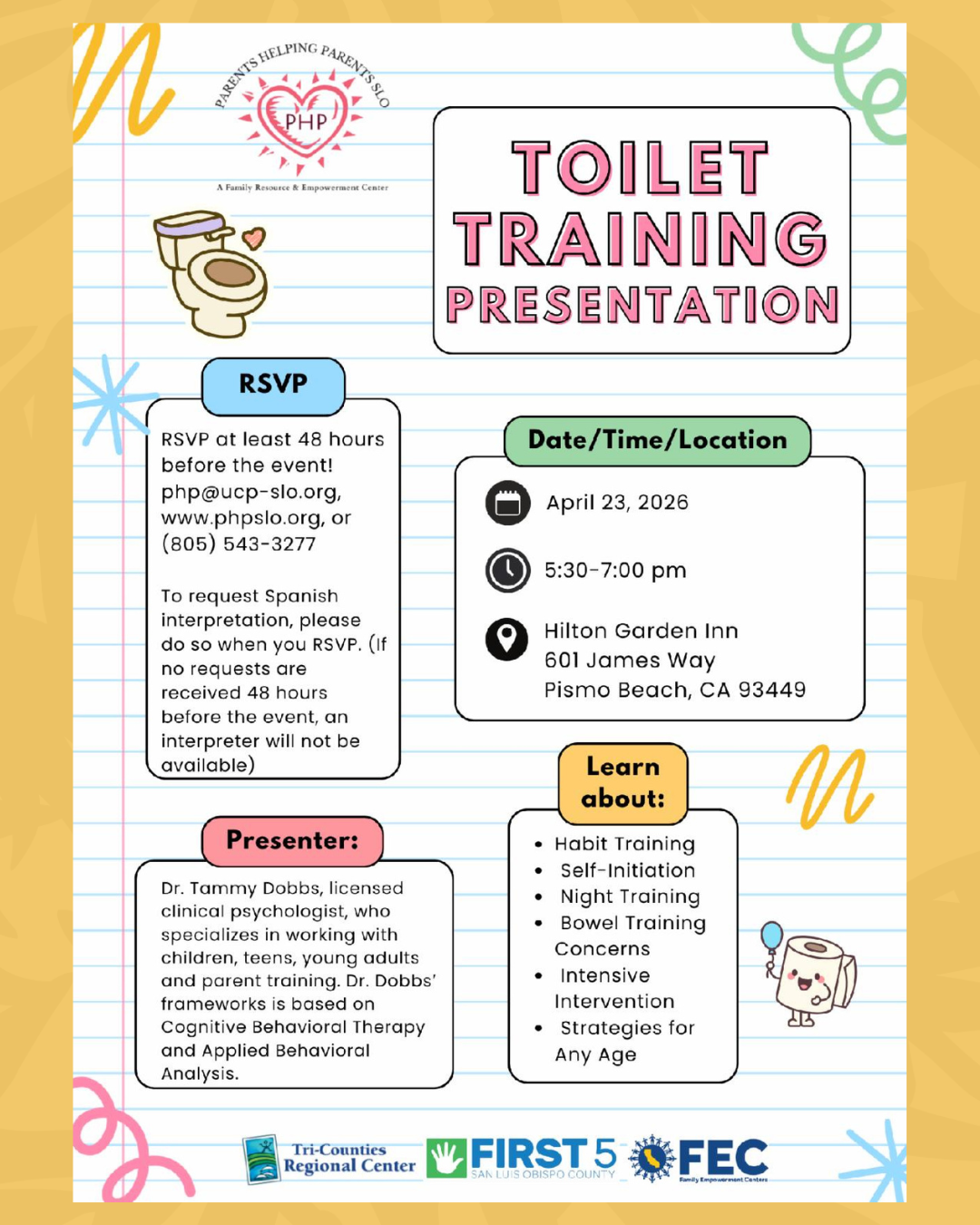 Join our partners at Parents Helping Parents for a helpful and practical Toilet Training Presentation designed for moms, dads, and caregivers. Learn research-based strategies for habit training, self-initiation, night training, bowel concerns, and more — for children of any age. Presented by Tammy Dobbs, a licensed clinical psychologist specializing in parent training and behavioral support.