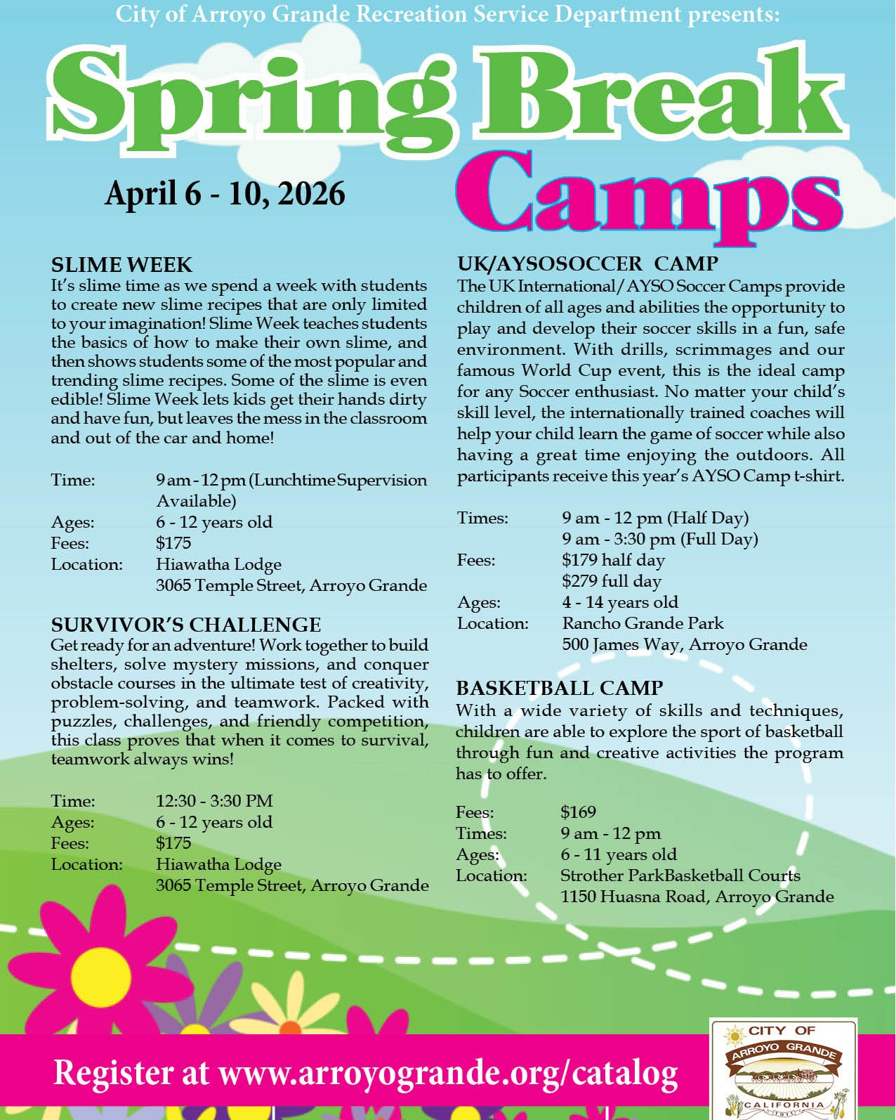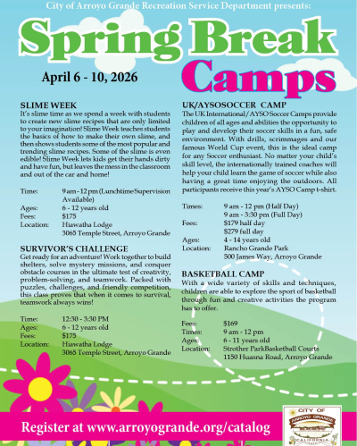 Looking for something fun for the kiddos during Spring Break? The City of Arroyo Grande is offering a week packed with creativity, adventure, and active play April 6–10th!