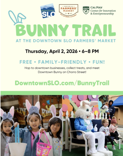 Hop into spring at the Bunny Trail! Join the fun at the Downtown SLO Farmers' Market on Thursday, April 2 | 6–8 PM in San Luis Obispo. Bring the kiddos to collect FREE treats from local businesses, snap a pic with the Downtown Bunny, and enjoy a full evening of family-friendly fun. Plus, the market is in full swing—five blocks packed with fresh produce, hot eats, sweets, crafts, and live entertainment. More info: downtownslo.com/events/bunnytrail