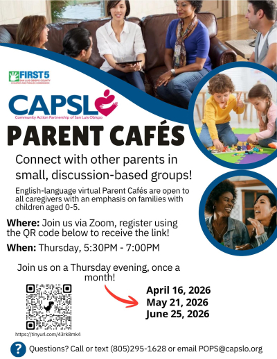 Join our partners at CAPSLO for their virtual Parent Café series! These are small, discussion-based groups designed to help you connect with other parents, share experiences, and find support.