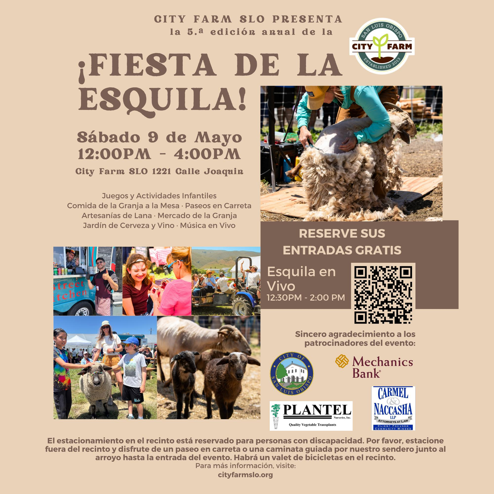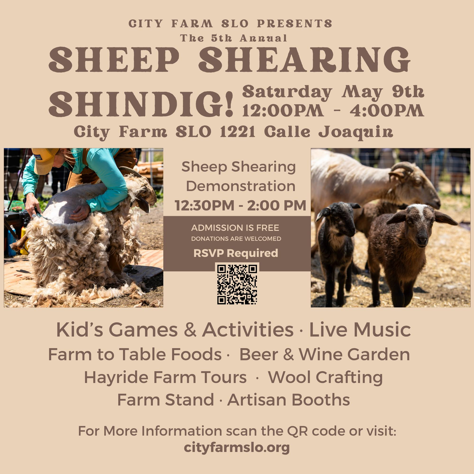 ¡Preparaos para pasar un rato muy divertido, familias! ¡Acompañad a City Farm SLO en su 5.ª edición anual de la «Sheep Shearing Shindig & Ag Festival» el sábado 9 de mayo, de 12:00 a 16:00! Contemplad el esquilado en directo, conoced a las ovejas Navajo-Churro y probad actividades prácticas con la lana, como el hilado y el fieltro.